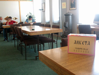 U prvoj polovini jula u biblioteci je sprovedena anketa među korisnicima. Na reprezentativnom uzorku od 5% članova pokušalo se utvrditi nekoliko stvari: mišljenje korisnika o radu biblioteke, interesovanja i preporuke korisnika za uspešniji rad, kao i vrste medija koje korisnici upotrebljavaju.