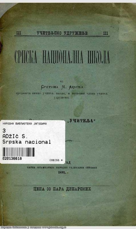 Kada se 1898. godine, na svečanom otvaranju Muške učiteljske škole u Jagodini, njen upravnik Sreten M. Adžić obratio gostima, istakao je značaj narodne prosvete koja je „osnovica za svekolike narodne i državne napretke“ i da „nigde nisu tako nedogledne zle posledice od lošeg majstora, kao što su u školi. Otuda su dobre učiteljske škole važna potreba državna i narodna“.Na predlog ministra prosvete i crkvenih poslova Andre Đorđevića, Narodna skupština aklamacijom je usvojila Zakon o ustanovljenju Muške učiteljske škole u Jagodini. Ministar je sa Sretenom Adžićem, profesorom Učiteljske škole u Nišu (koja je bila zatvorena zbog učestalih đačkih nereda preseljena u Aleksinac),odabrao mesto gde će biti otvorena nova učiteljska škola. Zatim je, poslao budućeg upravnika u Švedsku i Norvešku, da prouči kako su tamo organizovane narodne i učiteljske škole. U zgradi čije je zidanje započeto 1826.godine, a završeno desetak godina kasnije,koja je pripadala Magistratu okruga jagodinskog, uz najneophodnije prepravke i dva dozidana krila i u drugim pomoćnim zgradama, nalazila se, osim učionica i kabineta,trpezarija sa školskom kuhinjom,sala sa pozornicom za školske svečanosti i za gimnastiku… Sve je to trebalo, po Adžićevoj zamisli, „da stvori čoveka, poštena, razumna; čoveka zdrava, okretna, krepka; čoveka razborita, pravična i dostojanstvena; čoveka pravog, celog i potpunog“.