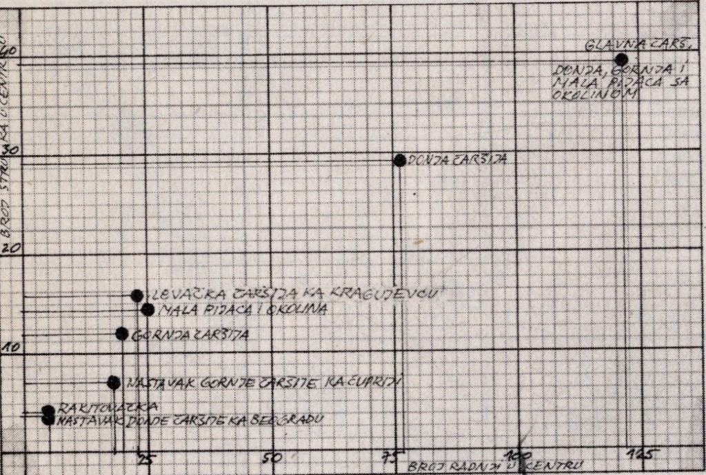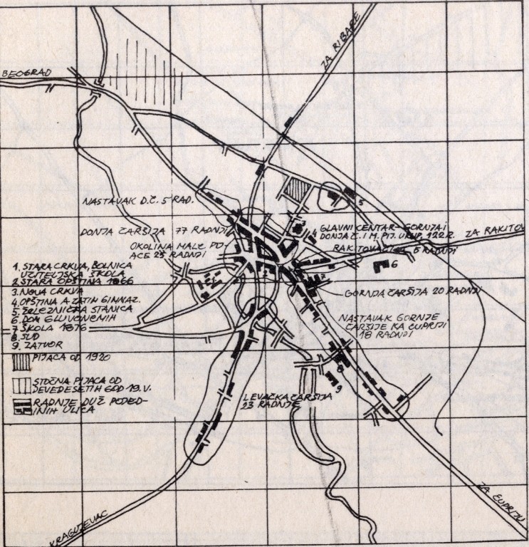 Brojna sačuvana dokumentai pisani izvori iz prošlog veka, podrazumevaju pod čaršijom poslovni, trgovački i zanatlijski deo varoši, ne uključujući u njega upravne i prosvetne građevine. Siromašna Srbija sa početka XIX veka ovakve zgrade skoro nije ni imala u svojim centrima, po negde samo crkvu. Javne građevine, po pravilu građene su van čaršije. Magistrati, sedišta varoških knezova, crkve, skromne škole, nalazile su sebi prostor negde na čaršijskim krajevima ili pored njih, pojedinačno ili u grupama. Za razliku od čaršije, centar grada tridesetih godina XX veka, sadržajno je bogatiji, zanati i trgovine su samo sastavni deo njegove strukture. Najznačajnije državne i društvene ustanove, zgrade banaka, školske ustanove, profesionalna udruženja kao i niz drugih zdanja koje nije poznavala nekadašnja čaršija, sada postaju uobičajene za centralnu zonu.