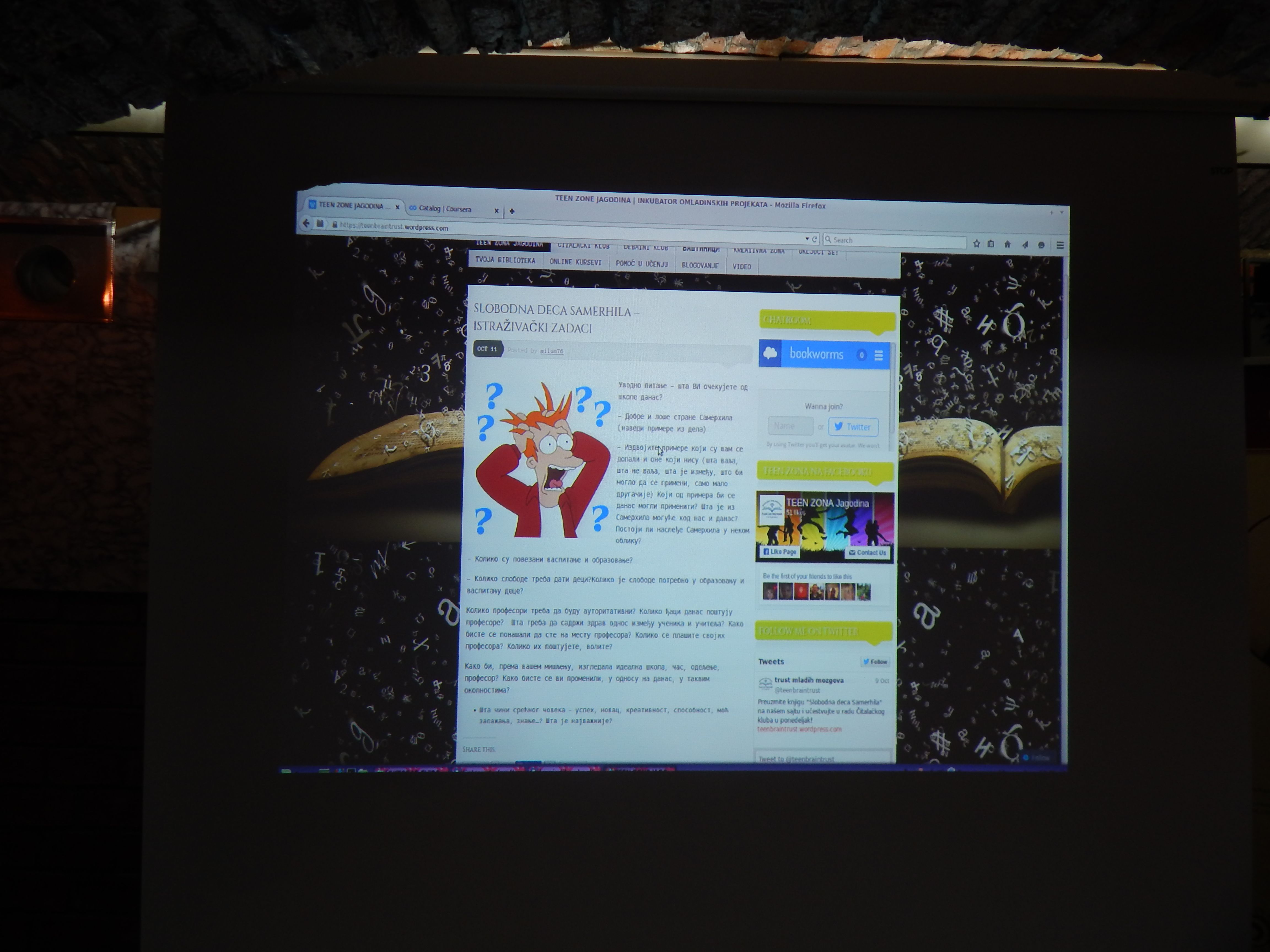 U Tin Zoni Narodne biblioteke održan je prvi sastanak Čitalačkog kluba. Uz pomoć ideja iz knjige „Slobodna deca Samerhila“, razgovarali smo o dobrim i lošim strane školskog sistema u Srbiji danas. Još jednom smo rekli da od škole danas i ovde očekujemo pomoć u ostvarivanju svojih potencijala, individualizovani pristup u nastavi, profesore kao uzor ponašanja i osobina i uopšte, pripremu za život koji nas čeka. Složili smo se da nam se u Samerhilu dopada sloboda, zajedničko odlučivanje učenika i profesora, uvažavanje dostojanstva učenika bez obzira na nivo znanja koji učenik pokazuje. Međutim, nedostatak vidljive hijerarhije ponekad vodi u anarhiju koja poništava sve ono zbog čega nam se Samerhil sviđa. Porazgovarali smo i o dres-kodu koji je aktuelna tema u školama u Srbiji, izneli različite stavove i složili se da je to idealna tema za predstojeći Debatni klub.