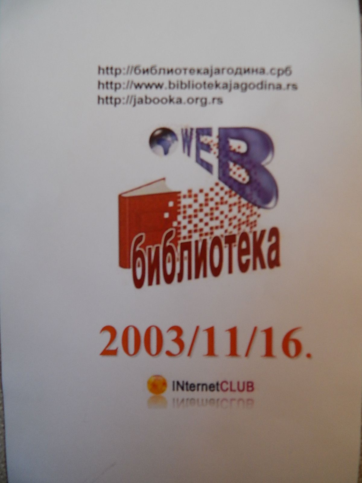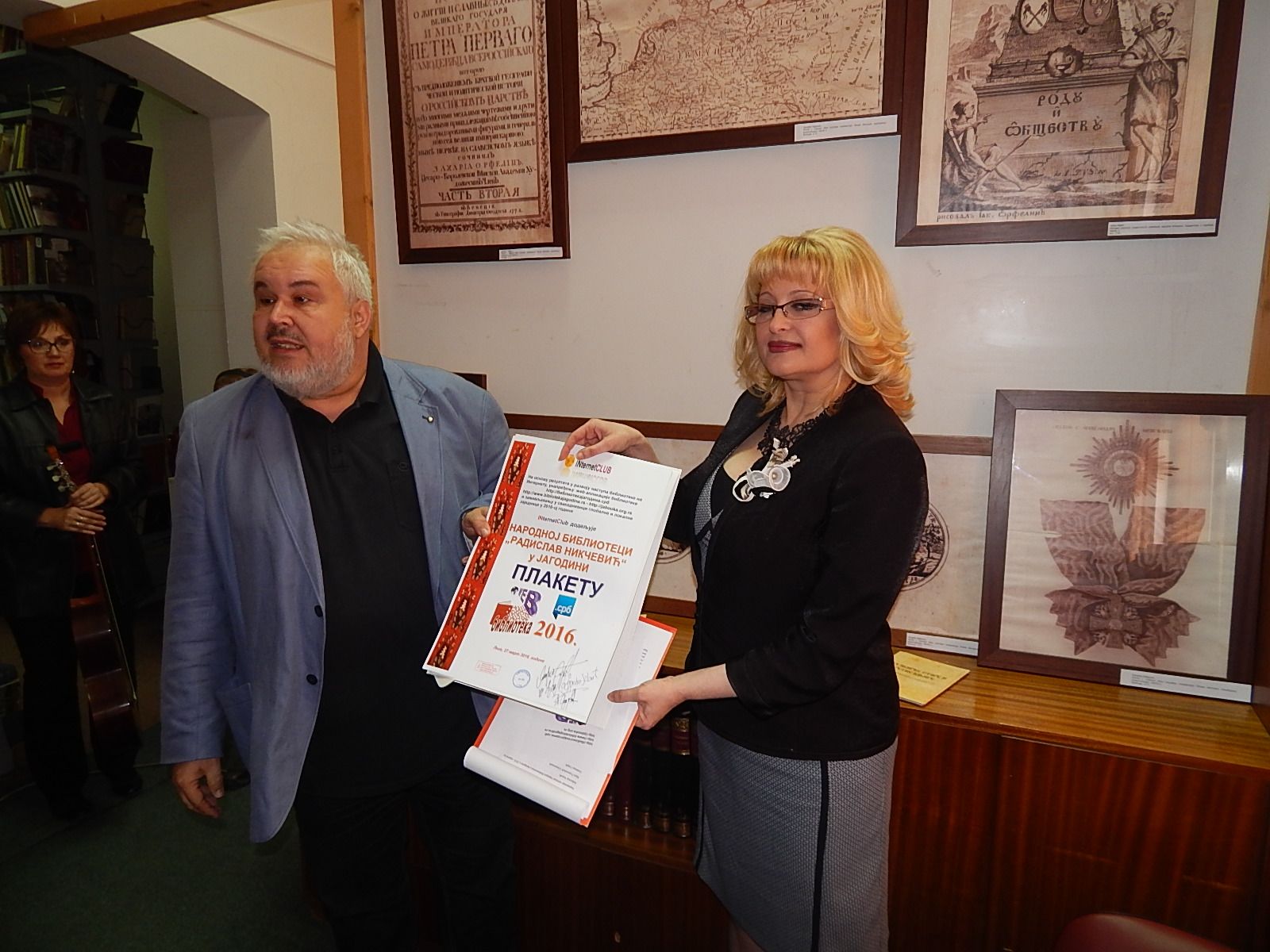 Na osnovu rezultata u razvoju nastupa biblioteke na internetu, unapređenju web aplikacije biblioteke www.jabooka.org.rs, www.bibliotekajagodina.rs i http://bibliotekajagodina.срб i zaživljavanju u svakodnevici globalne i lokalne zajednice, INternetClub dodeljuje Narodnoj biblioteci „Radislav Nikčević“ u Jagodini plaketu Web biblioteka 2016.