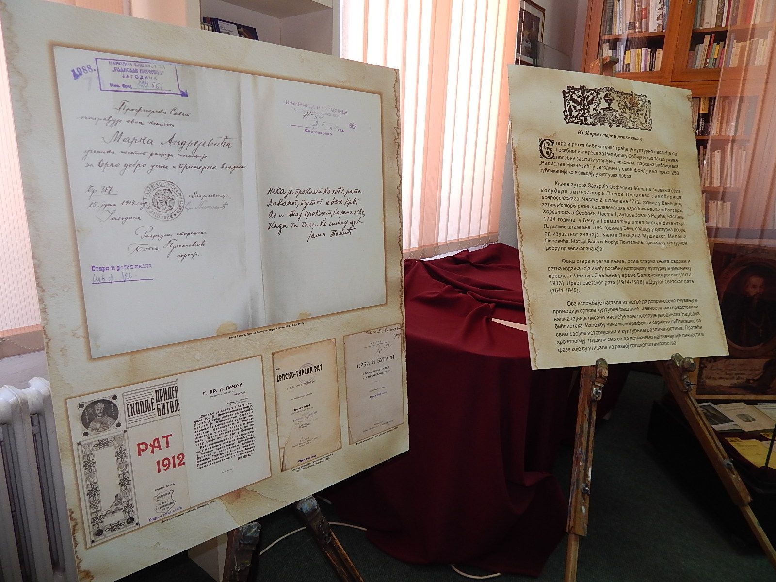 Svake godine, tog datuma, našim Jagodincima predstavimo deo naše istorije i kulturne baštine. Ove godine je otvorena izložba pod nazivom “Iz zbirke stare i retke knjige”, koju su uradile koleginice sa Zavičajnog odeljenja, Marija Crnković i Nada Dimitrijević. Upoznali smo naše sugrađane sa Fondom stare i retke knjige koji se čuva u jagodinskoj Biblioteci, a koji je sve vreme sakriven od očiju javnosti jer su neke od njih stare, rukopisne knjige koje se čuvaju u posebnim uslovima, neke od su proglašene kulturnim dobrom Srbije i ovo je retka prilika da se vide.