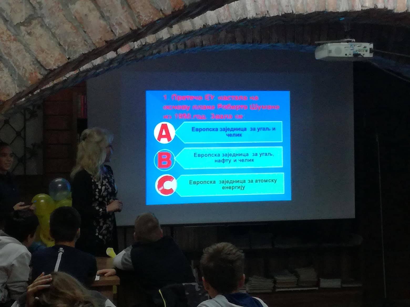 Druga aktivnost, bio je kviz: KOLIKO POZNAJEMO EVROPU. Kviz je održan 16. maja sa učenicma šestog razreda iz tri jagodinske osnovne škole ( OŠ „Rada Miljković“,OŠ „Milan Mijalković“ i OŠ „ 17. oktobar“) koji su se takmičili iz sledećih oblasti: Istorija Evrope, Geografija Evrope, Evropsko kulturno nasleđe, Simboli EU, Vrednosti EU i Agenda 2030. Sve tri ekipe su pokazale zavidno znanje, a pobedu su odneli učenici OŠ „ 17. oktobar“ i osvojili komplet knjiga