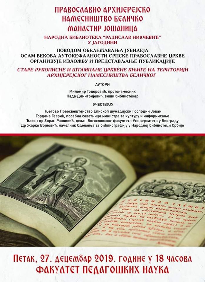 U petak, 27. decembra, na Fakultetu pedagoških nauka u Jagodini promovisana je monografija „Stare rukopisne i štampane crkvene knjige na teritoriji Arhijerijskog namesništva beličkog“.