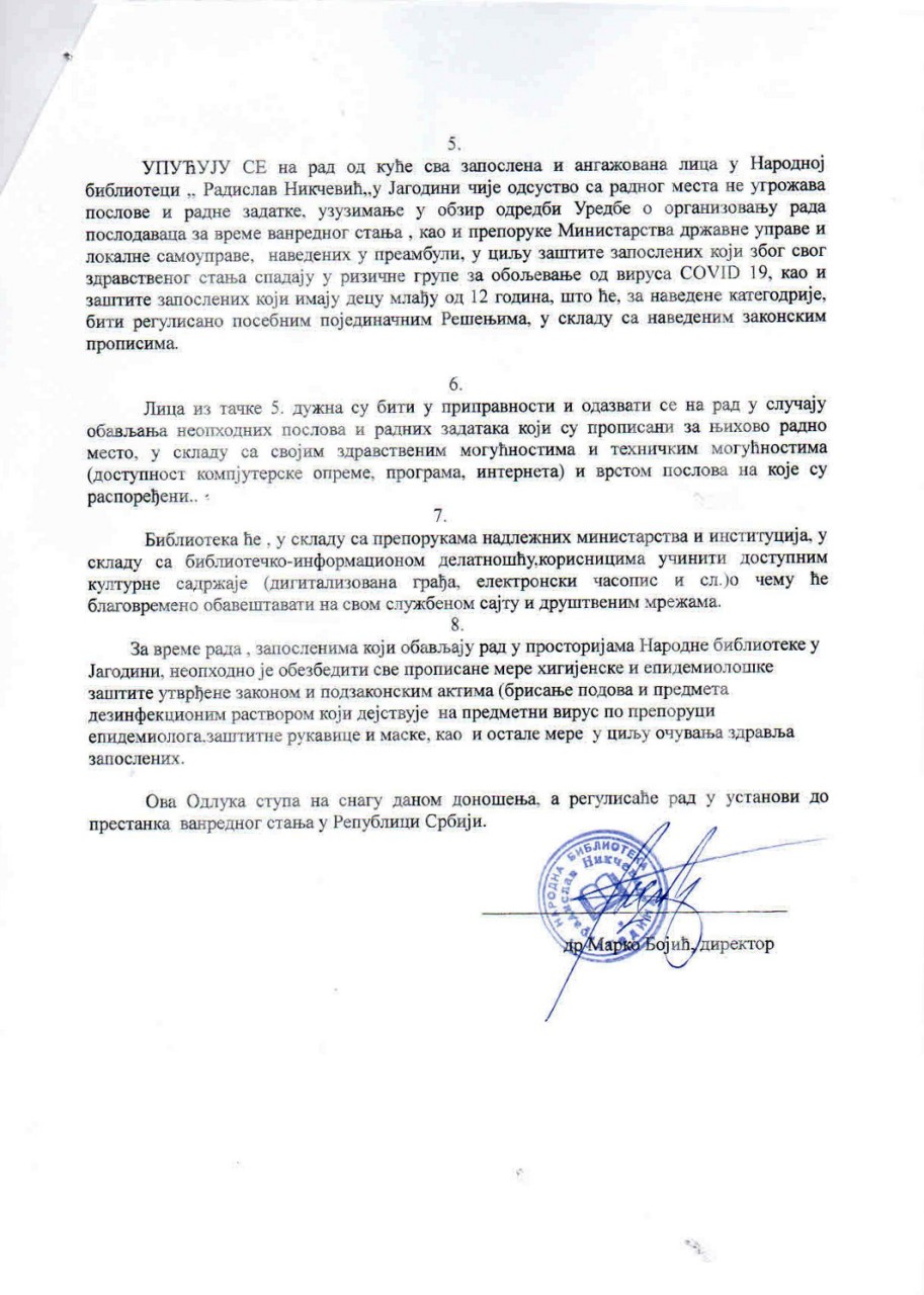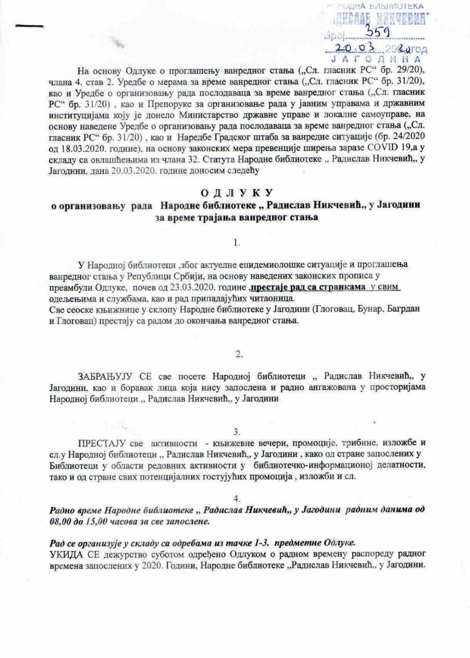 Na osnovu Odluke o proglašenju vanrednog stanja („Službeni glasnik RS“ br. 29/20), a u skladu sa epidemiološkom situacijom i zakonskim merama prevencije širenja zaraze COVID 19, direktor Narodne biblioteke „Radislav Nikčević“ dr Marko Bojić doneo je 20.03.2020. godine Odluku o organizovanju rada Narodne biblioteke „Radislav Nikčević“ u Jagodini za vreme trajanja vanrednog stanja. Odluka uključuje prestanak rada sa korisnicima, zatvaranje seoskih biblioteka i prestanak svih programskih aktivnosti biblioteke.