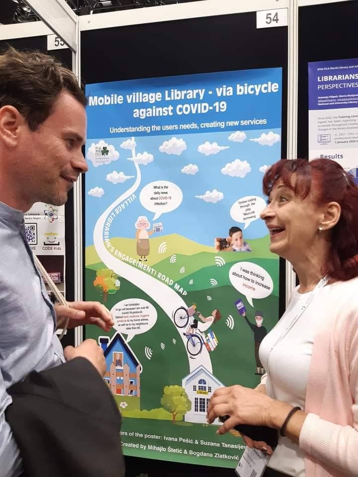 Ivana Pešić i Suzana Tanasijević predstavile su rad na temu “Mobile village Library – via bicycle against COVID-19“ (“Mobilna seoska biblioteka – biciklom protiv Kovid-19”). Tema ovog rada je inovativna usluga seoskog bibliotečkog ogranka u Selu Glavinci koji za cilj ima pružanje usluga seoskom stanovništvu putem mobilne biblioteke uz pomoć bicikla a usled zatvaranja zbog pandemije i nemogućnosti fizičkog dolaska korisnika u biblioteku. Tokom pandemije, seoska bibliotekarka je proširila uslugu tako što je starije stanovnike sela osim knjigama i štampom snabdevala i osnovnim životnim namirnicama i lekovima.