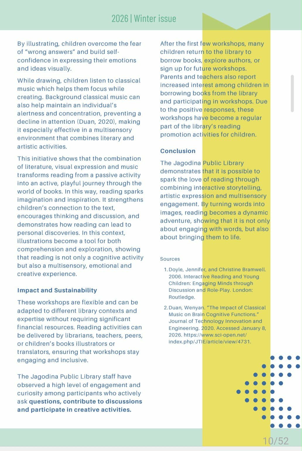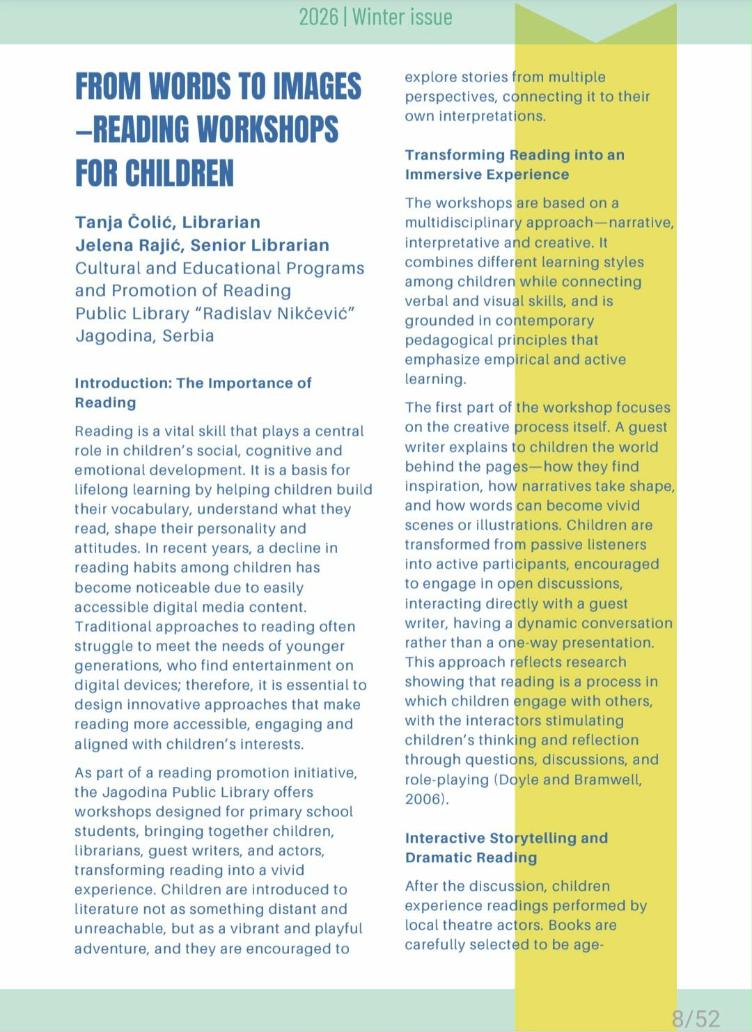Objavljivanje ovog članka ima i širi značaj jer doprinosi vidljivosti naše ustanove u globalnom bibliotečkom okruženju, omogućava razmenu iskustava sa kolegama širom sveta i podstiče dalji razvoj programa za decu i mlade.