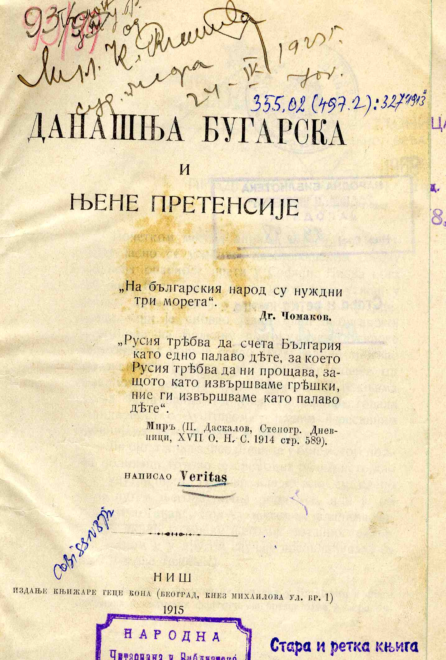 Naslov: Današnja Bugarska i njene pretensije / napisao Veritas
