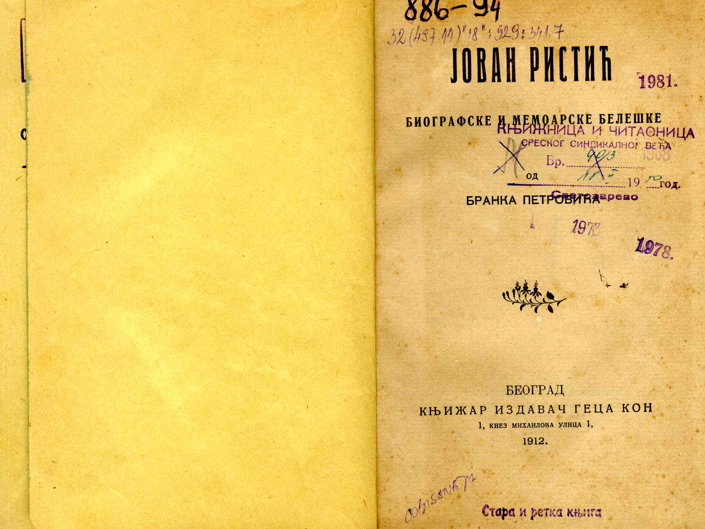 Naslov: Jovan Ristić : biografske i memoarske beleške / od Branka Petrovića