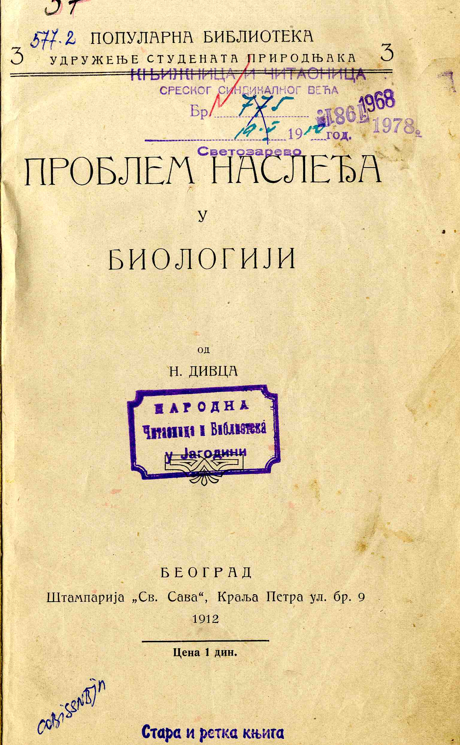 Naslov: Problem nasleđa u biologiji / od N.[Nedeljka] Divca