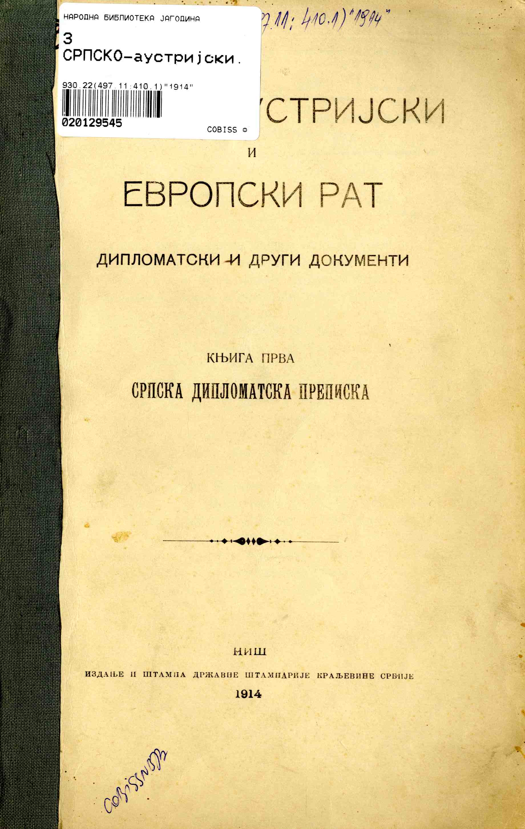Naslov: Srpsko-austrijski i evropski rat : diplomatski i drugi dokumenti. Knj. 1, Srpska diplomatska prepiska