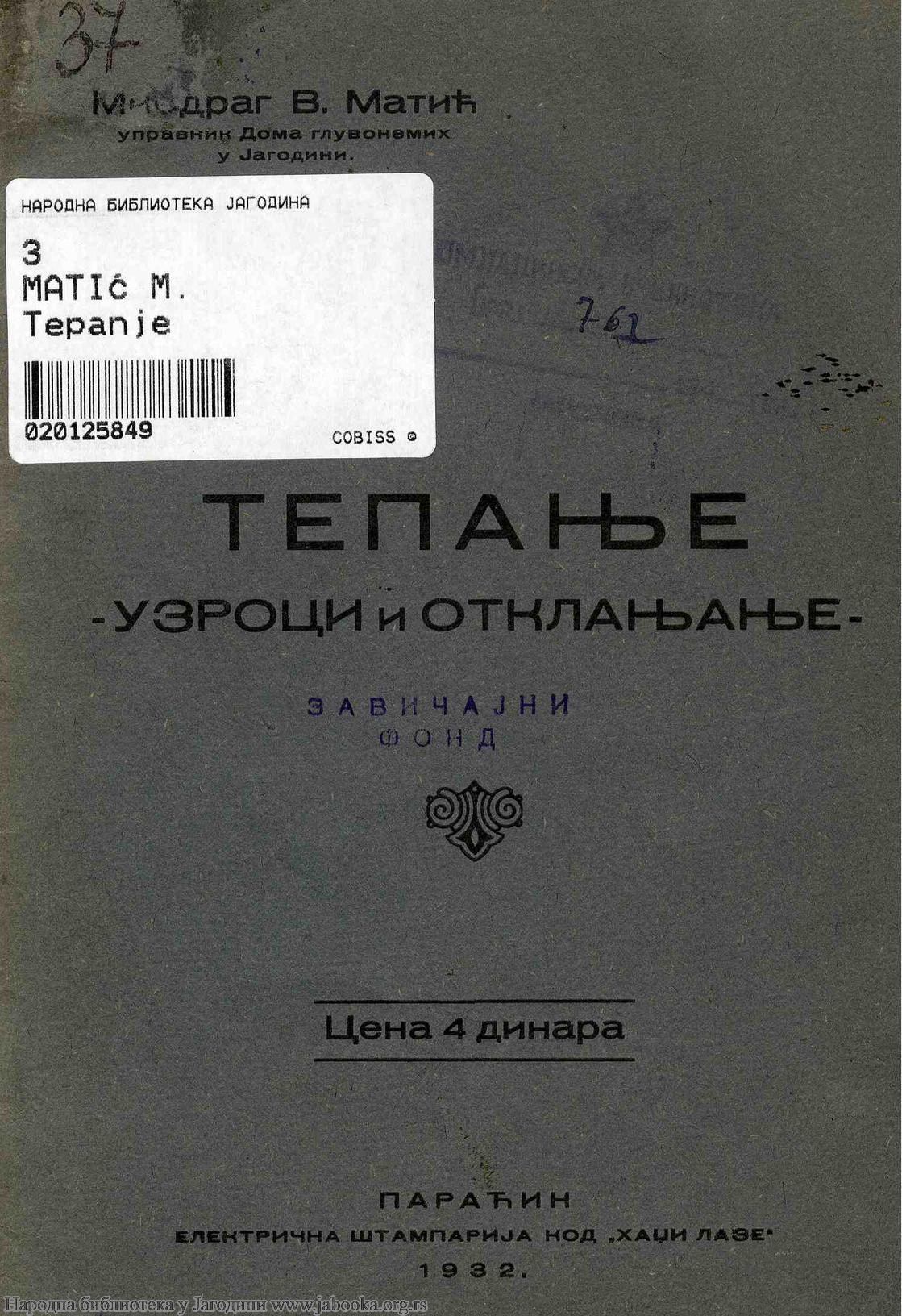Naslov: Tepanje : uzroci i otklanjanje / Miodrag V. Matić