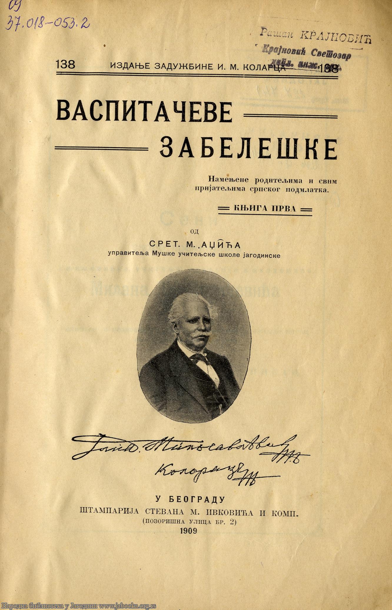 Naslov: Vaspitačeve zabeleške : namenjene roditeljima i svim prijateljima srpskog podmlatka. Knj. 1 / od Sret.[Sretena] M. Adžića
