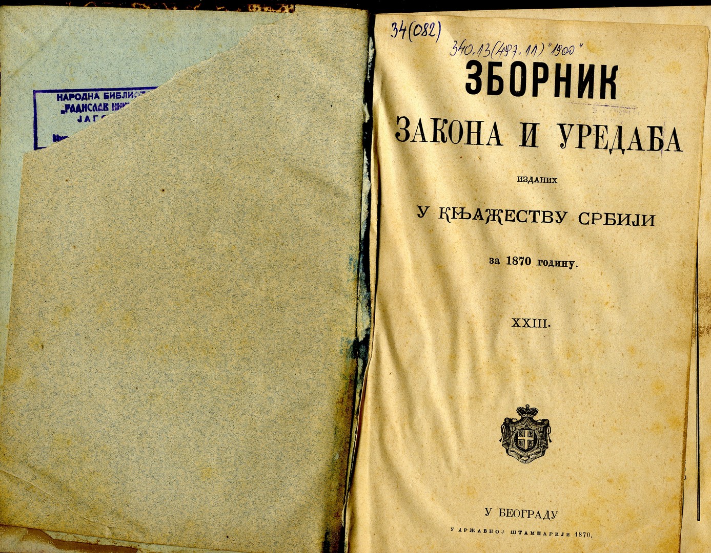 Naslov: Zbornik zakona i uredba izdanih u Knjažestvu Srbiji : za 1870 godinu. 23.